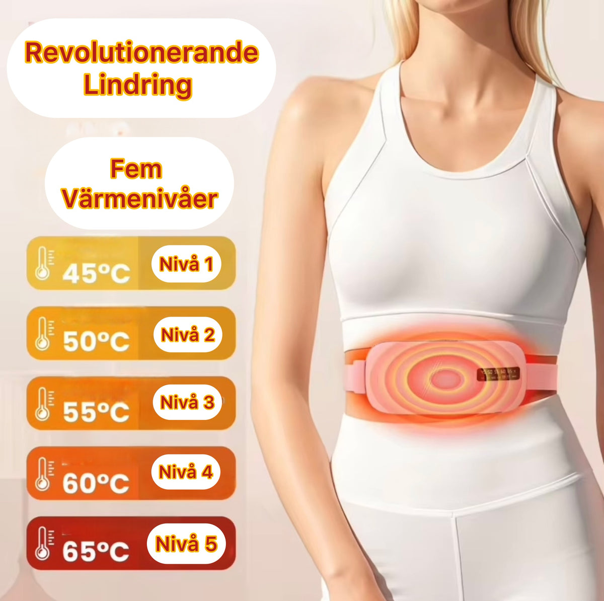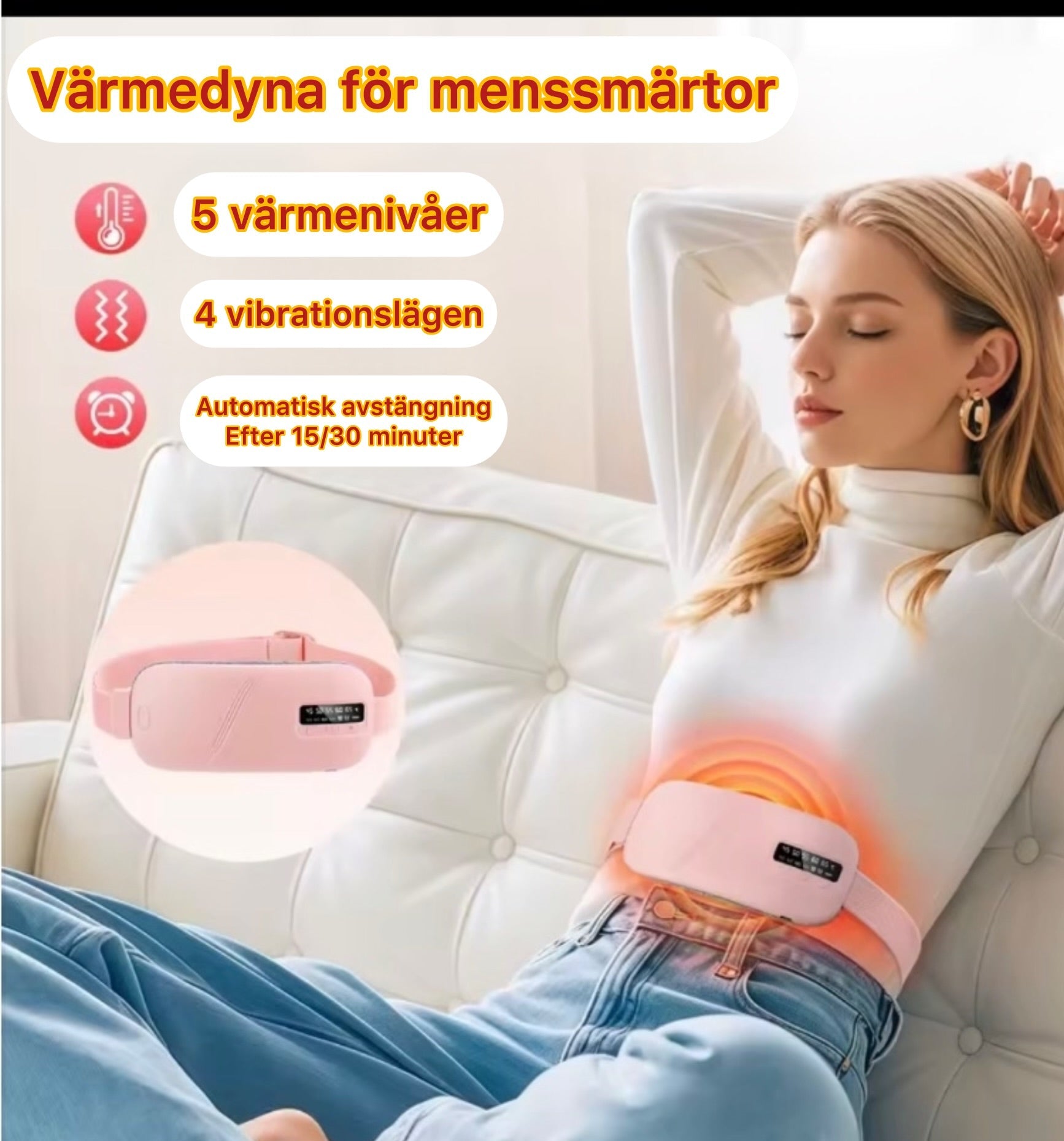 Upptäck den revolutionerande komforten av vårt värmeband, skapat för att lindra menssmärtor med en unik kombination av värme och vibrationsmassage, så att du kan återfå kontroll och njuta av varje dag utan besvär.
